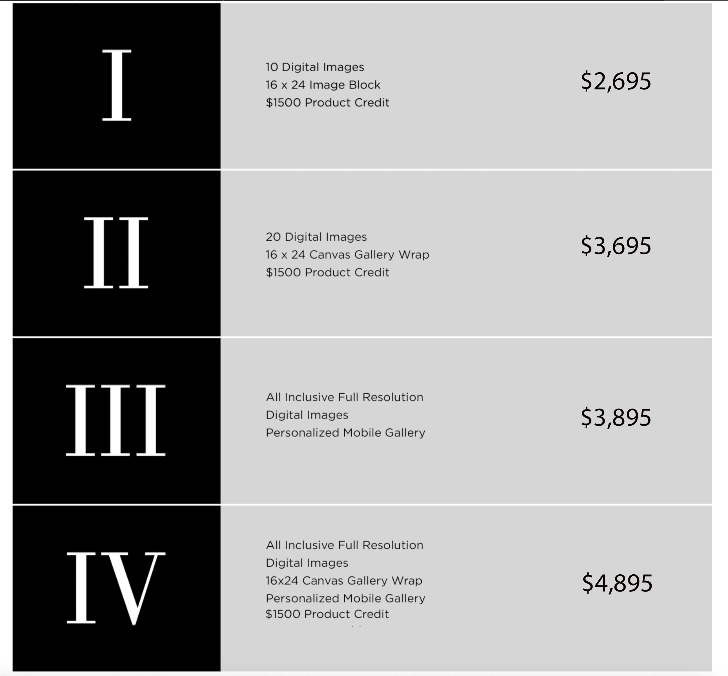 Pricing table with four tiers labeled I, II, III, and IV; each offers different digital art packages and prices ranging from $2,695 to $4,895.