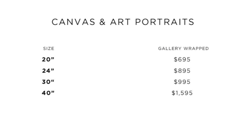Price list for canvas and art portraits with sizes 20, 24, 30, and 40 inches, and corresponding gallery wrapped prices of $695, $895, $995, and $1,595.