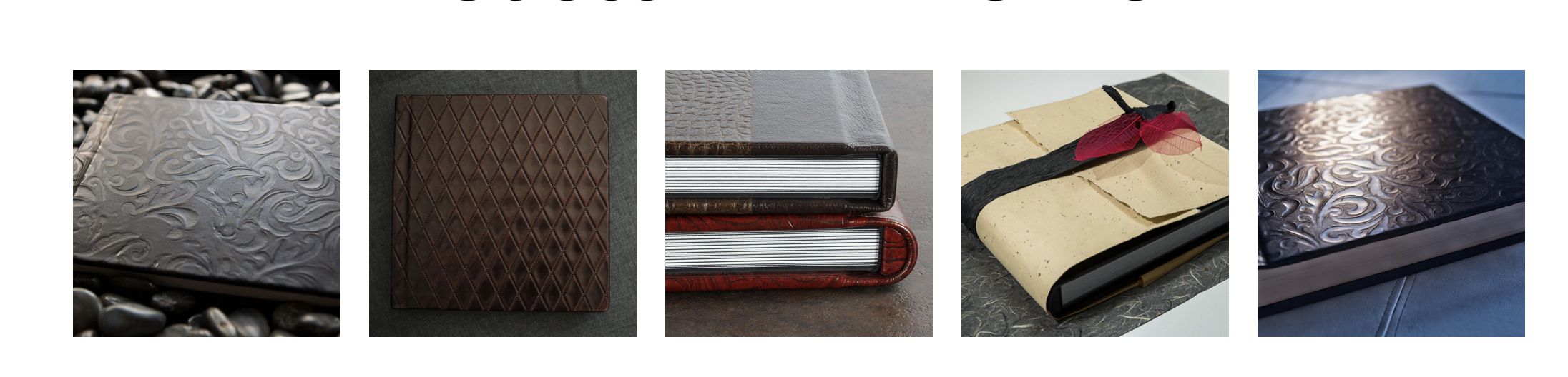 Collection of five leather-bound books and notebooks with embossed or textured covers.